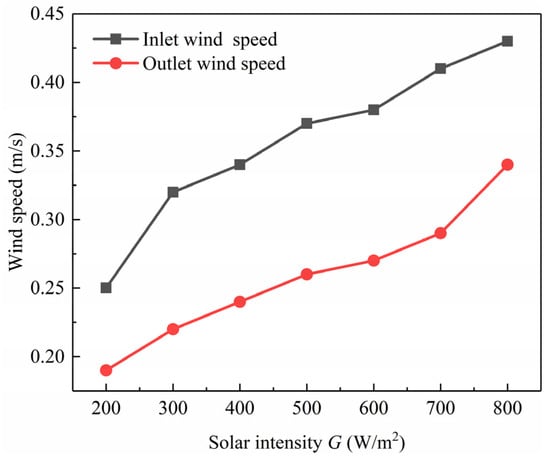 As illustrated in Figure 21, which depicts the relationship between light intensity and inlet/outlet air velocities, it can be seen that as the light intensity increases, the thermal effect of the Trombe wall enhances, resulting in an increase in both inlet and outlet air velocities. Notably, the inlet air velocity is higher than the outlet velocity, indicating the presence of air leakage in the experiment, which introduces a certain degree of error. With the increase in solar intensity, the flow efficiency within the Trombe wall improves, leading to an enhancement in the convective heat transfer efficiency.