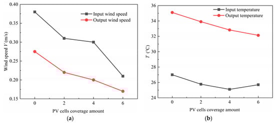 (a) Wind speed of inlet/outlet under different PV cell coverage amounts. (b) Temperature of inlet/outlet under different PV cell coverage amounts.