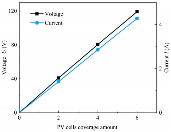 Voltage and current under different PV cell coverage amounts.