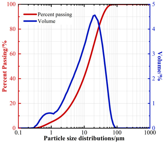 P·O 42.5 Portland cement was utilized, with its performance index, chemical composition, and particle size distribution detailed in Table 1 and Table 2, and Figure 1, respectively. As shown in Figure 1, the specific surface area of the P·O 42.5 Portland cement used in this study is 389.2 m2/kg. The CGS was sourced from China Hebei Construction and Geotechnical Investigation Group LTD., with its appearance, chemical composition, physical indices, and particle grading curve depicted in Figure 2 and Figure 3, Table 2 and Table 3, and a loss on ignition of 3.50%. Manufactured sand, derived from tailings crushing, served as the fine aggregate, with its appearance, physical indices, and particle grading curve presented in Figure 2, Table 3, and Figure 3, respectively, featuring a fineness modulus of 2.6, classifying it as Zone 2 sand. Coarse aggregate consisted of crushed stone ranging in particle size from 5 mm to 20 mm, with its physical indices outlined in Table 4. Tap water was employed for mixing purposes. Steel rebars, HRB400 type, possessed diameters of 14 mm, 18 mm, and 22 mm, respectively. The properties of the steel rebars were tested according to “Metallic materials —Tensile testing—Part 1: Method of test at room temperature” (GB/T 228.1-2021) [24], and the results are presented in Table 5.