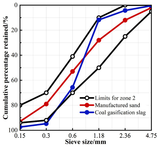 Coal gasification is a process in which coal reacts with a gasifying agent—typically oxygen and water vapor—under conditions of high temperature and high pressure or high temperature and atmospheric pressure. This process generates gaseous products such as carbon monoxide and hydrogen, along with residues. Coal gasification slag (CGS) is a solid waste generated during this process [10,11,12]. Existing studies have demonstrated that the coal chemical industry in China produced over 30 million tons of CGS in 2023 [13,14]. Due to the lack of effective resource utilization methods, a significant amount of CGS is disposed of through landfilling or open-air stacking [15], which poses a serious threat to groundwater and the surrounding soil environment. In recent years, many efforts have been made to find potential applications for CGS to avoid environmental pollution [16,17,18]. Zhu et al. [19] used CGS with a maximum particle size of 2360 μm to partially replace river sand in the preparation of ultra-high-performance concrete. They investigated the impact of the CGS replacement rate on the workability and mechanical properties of the concrete and elucidated the microscopic mechanisms by which CGS, used as a fine aggregate, influences the properties of ultra-high-performance concrete. Tian et al. [20] prepared an environment-friendly mortar using alkali-activated GBFS cementitious material instead of cement and CGS as a replacement for river sand. They focused on the effects of the alkali activator and curing age on the interfacial transition zone between CGS and cementitious material. H. Ganesan et al. [21] developed environment-friendly concrete with a 28-day compressive strength of up to 60 MPa by using ultrafine GBFS and CGS as partial replacements for cement and manufactured sand, respectively. H. Hamada et al. [22] conducted a comprehensive analysis of the effects of different dosages of CGS as a fine aggregate on the mechanical properties and durability of concrete. This provides theoretical support for promoting the use of industrial solid wastes in construction materials. Additionally, Li et al. [23] investigated the durability of concrete containing CGS as a fine aggregate under multiple ion erosions. They also elucidated the deterioration mechanisms of CGS concrete under combined sulfate and chloride salt erosion.