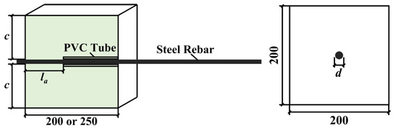 The experiment involved testing two types of concrete specimens: CGS concrete, employing CGS and manufactured sand as composite fine aggregate at a 1:3 mass ratio, and ordinary concrete using only manufactured sand as fine aggregate, serving as the control group. Both mixtures utilized a water–cement ratio of 0.5, with detailed concrete mix ratios provided in Table 6. Testing followed the “Standard for Test Methods of Physical and Mechanical Properties of Concrete” (GB/T 50081-2019) [25], yielding 28 days cubic (150 mm) compressive strengths of 46.30 MPa and 45.94 MPa for ordinary concrete and CGS concrete, respectively. Following the guidelines outlined in the “Standard for Test Methods of Concrete Structures” (GB/T 50152-2012) [26], no hoop steel rebar was incorporated within the concrete. The concrete size was set as 200 mm × 200 mm × 200 mm and 200 mm × 200 mm × 250 mm according to the steel rebar anchorage length, as depicted in Figure 4. In Figure 4, d represented the diameter of the steel rebar, la denoted the anchorage length, and c signified the protective layer thickness. The steel rebar extended 30 mm from the left side of the specimen to measure the displacement change at its free end, while it extended 270 mm from the right side of the specimen to serve as the loading end. The steel rebar inside the specimen that was not bonded to the concrete was isolated with a rigid PVC tube. Sealing rings were used at both ends of the PVC pipes to close the gaps between the pipes and the steel rebar, preventing concrete from entering the pipes during the casting process. To investigate the effects of fine aggregate type, steel rebar diameter, and steel rebar anchorage length on bond performance, 16 groups of specimens were designed, with each group consisting of three specimens. The geometric parameters of the specimens are detailed in Table 7.