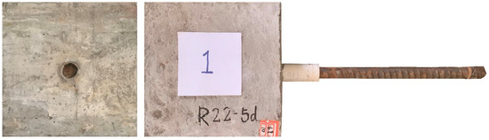 The damage mode characterized by steel rebar pull-out was identified by the absence of obvious damage to both the concrete and the steel rebar, wherein the steel rebar was extracted from the concrete. This type of damage primarily occurred in specimens featuring a small bond area between the steel rebar and the concrete. Taking specimen R22-5d as an illustration, the specimen did not change significantly at the beginning of loading, and the slip increased with the increase in stress. When loaded to 132.2 kN, the specimen made a splitting sound, and the slip increased significantly, and then reached its ultimate load of 139.9 kN. Subsequently, as loading persisted, the load decreased rapidly with increasing slip until the free end slip reached approximately one transverse rib spacing, the rate of load decrease slowed, the reinforcement was pulled out of the concrete, and the test was stopped. The damage pattern of the specimen is depicted in Figure 6, wherein the concrete remained intact without splitting or generating surface cracks, and the free end of the steel rebar slipped into the concrete.