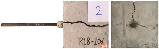 The concrete splitting damage mode was characterized by the steel rebar not being pulled off, while the concrete longitudinally split into several pieces. This type of damage predominantly occurred in specimens where both the diameter of the steel rebar and the bond length were substantial. In this test, two groups of specimens exhibited concrete splitting damage, namely R18-10d and R22-10d. Taking R18-10d as an example, during the preloading phase, the test exhibited similarities to the steel rebar pull-out damage pattern, with no obvious occurrences and the load rising in tandem with displacement increase. However, when the load reached 145.4 kN, a distinct splitting sound emanated from the specimen, accompanied by a sharp decrease in load, leading to the termination of the test. The damaged morphology of the specimen is depicted in Figure 7, wherein the crack fully traverses from the surface of the steel rebar to the edge of the concrete, causing the concrete specimen to split into three parts. Cracks on the side of the concrete ran along the direction of the steel rebar throughout the specimen. This phenomenon arose due to the inadequate toroidal confinement provided by the concrete when the bond area between the steel rebar and the concrete was substantial, thereby failing to counteract the elevated stress induced by the bond-slip of the steel rebar, ultimately resulting in the splitting damage of the specimen.