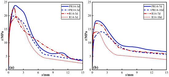 τ-s curves for specimens of different concrete types: (a) comparison of PR14 and R14 at anchorage lengths of 3d and 5d and (b) comparison of PR14 and R14 at anchorage lengths of 7d and 10d.