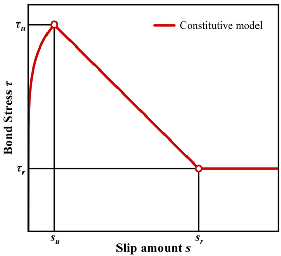Based on the modified BPE constitutive model [8,33,34], the τ-s curve is simplified into three segments (Figure 11): the rising section, the falling section, and the residual bond stress section. That is, the micro-slip stage and slip stage are grouped into a rising section, which aligns with the characteristics of τ-s curves and enhances the simplicity of the constitutive model [35,36,37]. Given the similarity between the model curve division stages and the test curve of CGS concrete, the τ-s constitutive model of CGS concrete is established based on the modified BPE model. The model equation is presented as Equation (2).