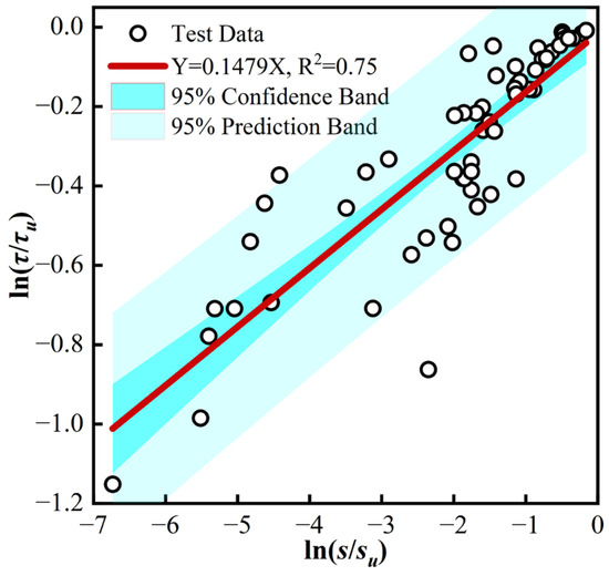 Considering the complexity of bond-slip behavior between steel rebar and concrete, the BPE constitutive model defined a shape parameter (α) to adjust the rising section of the bond-slip constitutive model, thereby reflecting its nonlinear characteristics. This parameter significantly influences the shape and slope of the rising section of the bond-slip constitutive model, thereby providing a more realistic reflection of the bond-slip behavior between steel rebar and concrete. The calculation formula for α is provided in Equation (8). Random points were selected from the rising section of each τ-s curve, and α was calculated according to Equation (8). The calculation results are summarized in Table 12. Subsequently, the obtained data underwent further fitting, resulting in a final α value for the rising section of the τ-s constitutive model of CGS concrete, which was determined to be 0.1479. This was achieved with a correlation coefficient of R2 = 0.75. The fitting results are depicted in Figure 12.