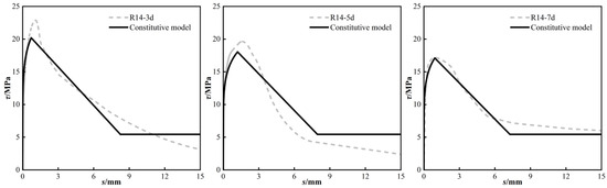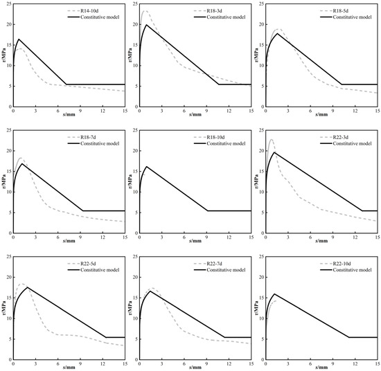 The τ-s curves of three groups of specimens, namely R14-7d, R18-7d, and R22-7d, along with the correspondence between d and τu, are depicted in Figure 10. Observations from Figure 10 reveal the following: