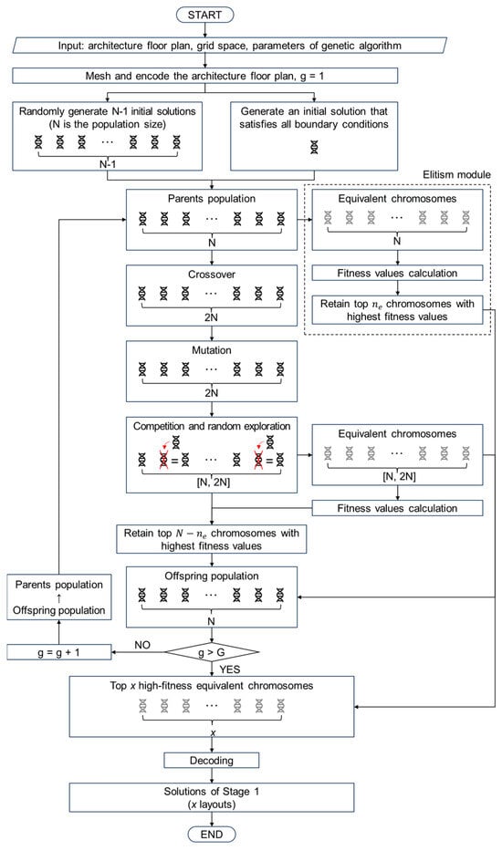 | Input: the coordinates of the boundary of beam–slab structure, the columns supporting the beam–slab structure, and the walls above the beam–slab structure as the architecture floor plan; the grid space; and the parameters of genetic algorithm including the population size N, the initial mutation probability μ_1i, the maximum generations G, and the number of local optimal solutions to be output x. Mesh and represent the architectural floor plan using binary encoding as Equation (4) for k ← 0 to limit by N-1 do Generate a list named chromosome representing beam–slab structural layout scheme, where all values are randomly 0 or 1 equivalent_chromosome ← chromosome for j ← 0 to limit by range(chromosome) do if chromosome [j] = 1 and Assumption 5 = False then equivalent_chromosome [j] = 0 parents_population [i] ← chromosome equivalent_parents_population [i] ← equivalent_chromosome Generate a list named chromosome, where all values are 1, and append it to parents_population and equivalent_parents_population for current generation g to limit by G do for equivalent_chromosome in equivalent_parents_population do Check the amount of beam segments in the layout corresponding to the equivalent_chromosome do not satisfy the requirement of assumption 6 Calculate the fitness value of the equivalent_chromosome as Equation (14) Sort the lists parents_population and equivalent_parents_population by fitness value from highest to lowest for i ← 0 to limit by the number of individuals retained by elitism n_e do elitism [i] ← parents_population [i] for chromosome in parents_population do parent_1 ← chromosome parent_2 ← item randomly choiced from parents_population offspring_chromosome_1 and offspring_chromosome_2 ← parent 1 and parent 2 single-point crossover Append offspring_chromosome_1 and offspring_chromosome_2 to the list offspring_population calculate current mutation probability μ_1 as Equation (15) for offspring_chromosome in offspring_population do for item in offspring _chromosome do if p < μ_1 then item ← 0 or 1, with a probability of 50%, respectively for i ← 0 to limit by 2N-1 do for j ← i + 1 to limit by 2N do if offspring_population [i] = offspring_population [j] then Remove offspring_population [j] from offspring_population while len(offspring_population) < N do append a new random chromosome to offspring_population for i ← 0 to limit by len(offspring_population) do equivalent_chromosome ← offspring_population [i] for j ← 0 to limit by range(equivalent_chromosome) do if offspring_population [i][j] = 1 and Assumption 5 = False then equivalent chromosome [j] = 0 equivalent_offspring_population [i] ← equivalent_chromosome for equivalent_chromosome in equivalent_offspring_population do Check the amount of beam segments in the layout corresponding to the equivalent_chromosome do not satisfy the requirement of assumption 6 Calculate the fitness value of the equivalent_chromosome as Equation (14) Sort the lists offspring_population and equivalent_offspring_population by fitness value from highest to lowest offspring_population ← offspring_population [:N] for i ← 0 to limit by n_e do offspring_population [-i-1] ← elitism [i] Sort the lists offspring_population by fitness value from highest to lowest for k ← 0 to limit by x do Decode and visualize the offspring_population [k] as the Output of Stage 1 |