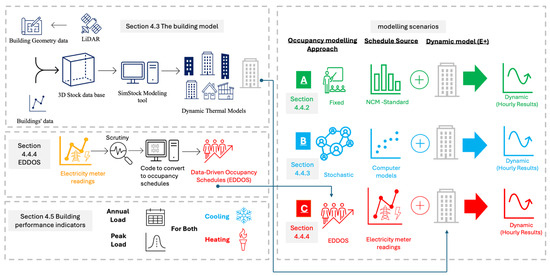 Specifically, previous studies demonstrate three approaches for occupancy modelling in district-level energy simulations. The first approach relies on schedules of occupants’ presence, use of light and equipment, and hot water. This approach, which is adopted by building performance standards such as ASHRAE standard 90.1 and the UK National Calculation Method (NCM) [27], has been traditionally used in building energy simulation studies for years. The use of fixed occupancy schedules in urban-scale energy modelling presents both advantages and disadvantages. On the plus side, they offer a simple, straightforward approach to modelling, which can be beneficial for large-scale urban energy assessments where detailed data may not be available. Also, the consistency of profiles allows for easier comparison across different buildings and scenarios [28]. In addition, these schedules are derived from established guidelines and are easy to implement in simulation tools, making them accessible for practitioners who may not have the resources to develop complex, data-driven models [29]. Standard schedules also provide a baseline for policymakers to evaluate energy performance and develop energy conservation measures at an urban scale, especially when detailed occupancy data are unavailable [29]. On the other hand, as the standard-based occupancy schedules do not reflect the actual occupancy patterns, their use can lead to significant discrepancies between predicted and actual energy consumption. This is particularly problematic in non-residential buildings where occupancy patterns can vary widely from one building to another [30,31,32].