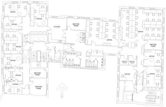 As clarified in Section 3, this study focuses on one higher education office building from the UCL Bloomsbury campus in central London. The building, called UCL Central House, is a six-storey building, which mainly accommodates offices and meeting rooms (for academic staff and PhD students) along with the Bartlett Library on its ground floor. The building was selected as a case study since it was representative of one type of (office-dominated) Bloomsbury campus building and its metered gas and electricity use was collected for a number of years. Figure 2 illustrates the building’s typical floor plan.