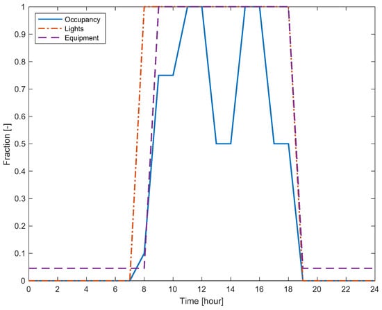 Figure 3. Weekday schedules of occupancy, lights, and equipment used in the standard-based scenario.