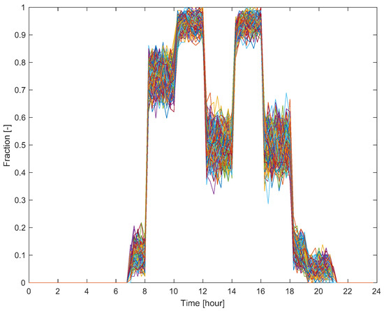 Figure 4. Non-repeating weekday occupancy schedules resulting from averaging the randomly generated presence profiles of 84 occupants in one of the building floors.