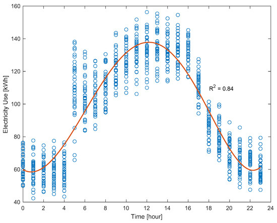 Figure 5. Electrical consumption versus hours of the day for the year 2019. Each circle represents metered electricity used at a certain hour.