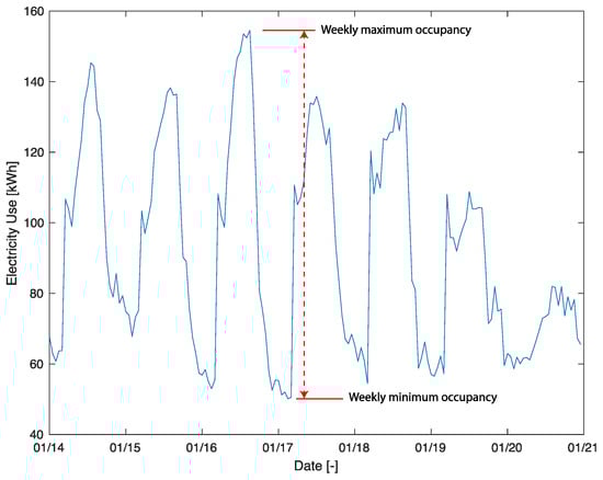 Figure 6. An example weekly profile of electricity consumption and assignment of minimum and maximum occupancy based on minimum and maximum electricity use.