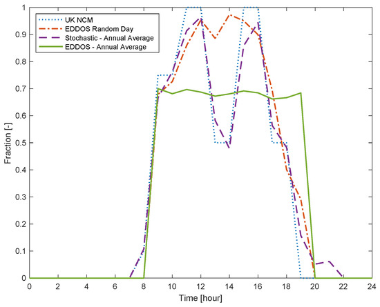 Figure 7 illustrates the daily occupancy profiles resulting from the different occupancy-modelling methods investigated in this study: a standard-based fixed schedule used for all simulation weekdays (UK NCM) and an aggregated occupancy profile resulting from averaging all weekday profiles generated by the stochastic occupancy model (Stochastic Annual Average), along with a randomly selected profile from EDDOS (EDDOS Random Day) and its annual average profile (EDDOS Annual Average).