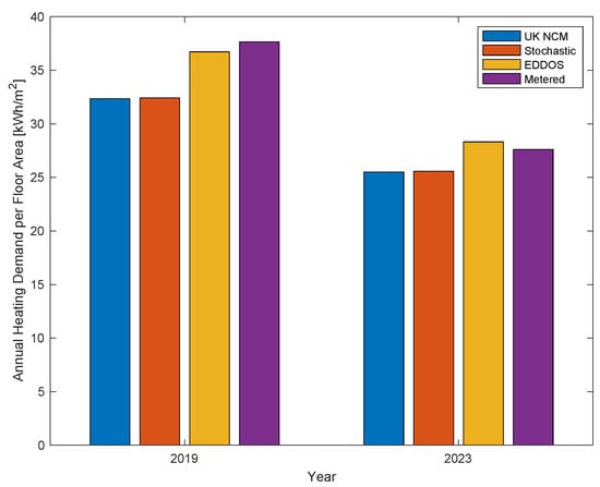 Figure 8. Annual heating demand as estimated by the building model populated with standard-based (UK NCM) occupancy schedules, stochastic occupancy model, and energy-data-driven occupancy schedules (EDDOSs), compared with metered heating energy in years 2019 and 2023.