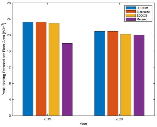Figure 9. Hourly peak heating demand as estimated by the building model populated with standard-based (UK NCM) occupancy schedules, stochastic occupancy model, and energy-data-driven occupancy schedules (EDDOSs), compared with metered heating energy in years 2019 and 2023.