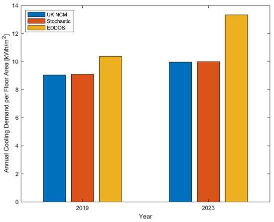 Figure 10. Annual cooling demand as estimated by the building model populated with standard-based (UK NCM) occupancy schedules, stochastic occupancy model, and energy-data-driven occupancy schedules (EDDOSs) in years 2019 and 2023.
