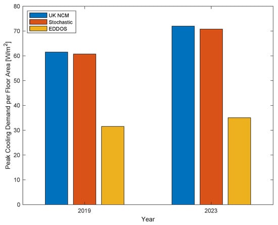 Figure 11. Peak cooling demand as estimated by the building model populated with standard-based (UK NCM) occupancy schedules, stochastic occupancy model, and energy-data-driven occupancy schedules (EDDOSs) in years 2019 and 2023.