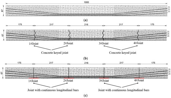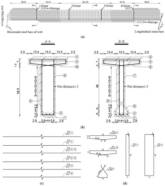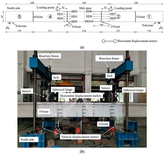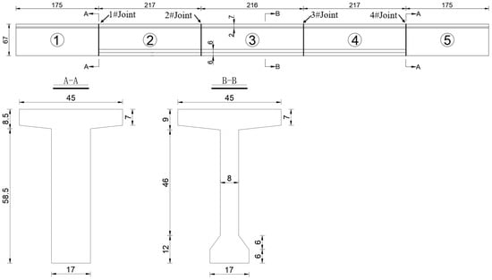 The test beams were 10 m long and 0.67 m high, and consisted of 5 segments assembled by internally bonded prestressing tendons. Segments 1#–5# utilized T-shaped section, and the section sizes of the test beams are shown in Figure 1.