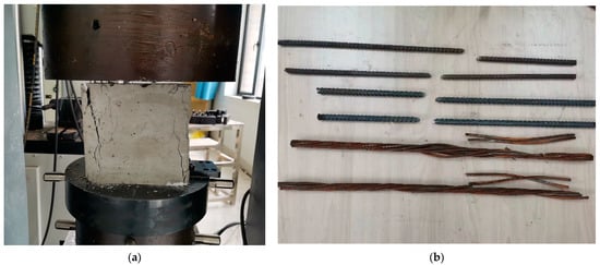 Material characteristic tests: (a) compressive test of the concrete; (b) axial tensile test of the reinforcement and prestressing tendon.
