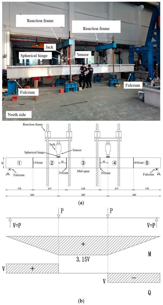 Loading diagrams (unit: cm): (a) loading layout; (b) distributions of bending moment and shear force.