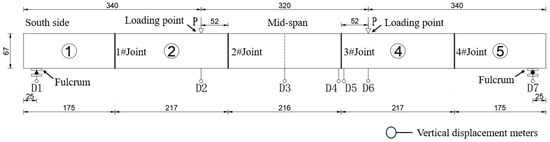 In order to measure the deflection distribution of the main beam and the relative sliding displacement of the joints on both sides, displacement meters were arranged at the fulcrum of the main beam, the quarter point, the middle span, and the joint. Vertical displacement measuring points were arranged, as shown in Figure 7.