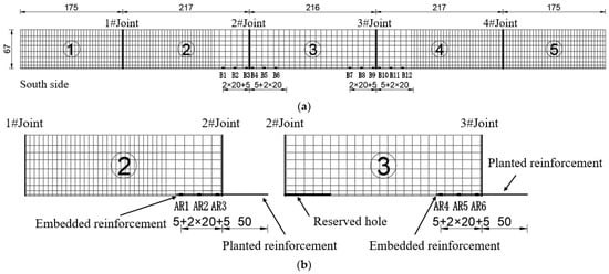 To measure the opening width of the joint after cracking, five displacement transducers were arranged at joint 3# and joint 4#, as shown in Figure 6.