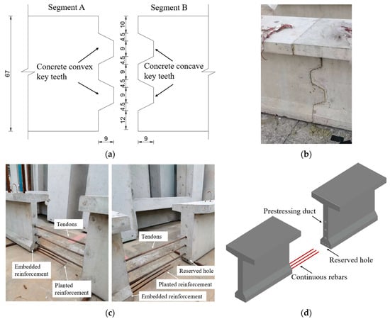 Schematic diagrams of the test specimens and joints (unit: cm): (a) concrete key size and shape; (b) concrete key joint; (c) the embedded steel bars and reserved hole; (d) continuous rebars in the joint.