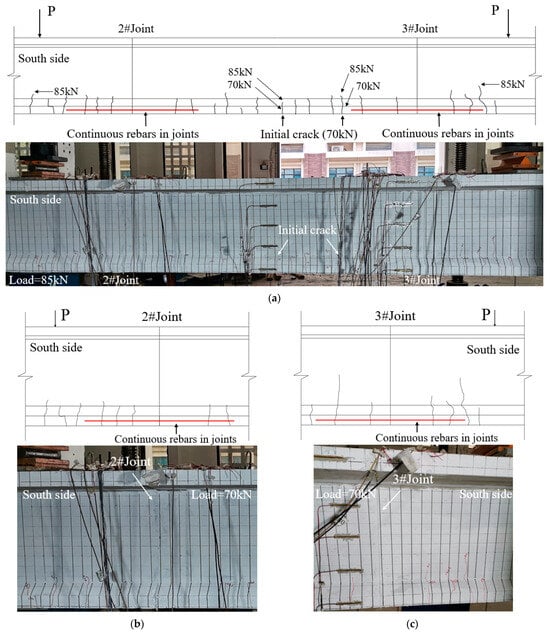 When the loading force was 70 kN, vertical bending cracks appeared along the bottom edge of the midspan. The maximum width of the cracks was 0.054 mm, and the length of the cracks was about 20 mm. In the subsequent loading process (when the loading force was 70–85 kN), a number of vertical bending cracks appeared successively along the bottom edge of the midspan and near the loading point, forming incipient cracks. At this time, no cracks were found at joints 2# and 3#, as shown in Figure 10.