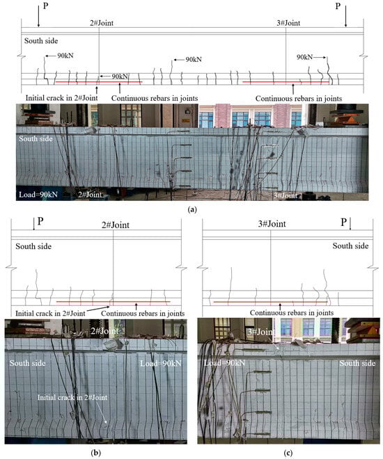 Crack development as joint 3# cracked: (a) pure bend section; (b) joint 2#; (c) joint 3#.