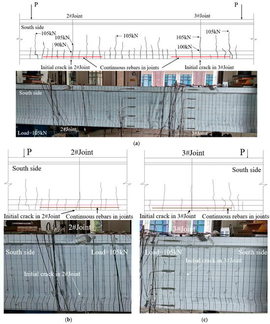 At a load of 100 kN, vertical bending cracks which were approximately 7 cm long and 0.129 mm wide appeared in the mortar layer of the joint in segment 3#. The crack progressed rapidly, and by a loading force of 105 kN, its extension length matched that observed at other positions (loading point, midspan), as depicted in Figure 12. By this point, the crack widths at joints 2# and 3# had exceeded to 0.2 mm.