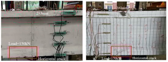 During the subsequent loading process, a large number of new cracks appeared successively on the floor of the midspan and at the loading point. At the same time, incipient cracks continued to develop, and the rate and width of the crack extension to the top plate at joints 2# and 3# were comparable to other locations of the specimen (mid-span and loading point). When the loads were 150 kN and 170 kN, horizontal cracks along the direction of the continuous rebars appeared successively at joints 2# and 3#, as shown in Figure 13. The appearance of the cracks directly led to local anchorage failure of the continuous rebars, resulting in some rebars reaching yield. This weakened the cracking resistance of the joint, serving as a catalyst for joint opening.