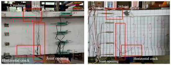 When the horizontal cracks near the continuous rebars appeared, there was a significant decrease in the specimen’s stiffness. However, these cracks did not result in complete anchorage failure of the continuous rebars. The specimen quickly underwent internal stress redistribution and continued to support the load, causing fluctuations in the corresponding load–displacement curve. During the subsequent loading process, the horizontal cracks near the continuous rebars gradually expanded and developed, weakening the bending stiffness of the joints, inducing openings at joints 2# and 3#, causing the neutral axis of the joint surface to move upwards, reducing the concrete area in the compression zone. Ultimately, this caused the top edge of the joint to collapse, resulting in structural damage, as shown in Figure 14.