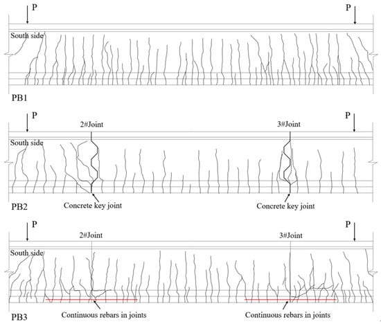 Owing to the effective transmission of normal stresses by longitudinal steel bars, the bending cracks in the pure bending section of beam PB1 were fully developed. Nonetheless, beam PB2 lacked the limitation of ordinary steel bars on the crack width at the joint position, resulting in the development of structural cracks mainly concentrated at the joint, forming a weak part in the structural bending resistance. In comparison to beam PB2, the inclusion of continuous longitudinal rebars at the joints of beam PB3 addressed bending deficiencies, enhanced the cracking load capacity of the joints, and effectively transferred normal stresses between sections across the joints. This structural improvement resulted in crack propagation patterns more akin to those observed in beam PB1. The crack patterns are depicted in Figure 15.