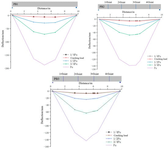 Before cracking, each specimen exhibited significant stiffness, with beams PB2 and PB3, similar to beam PB1, experiencing uniform deformation. As vertical loading increased, all specimens developed varying degrees of cracks, leading to gradual stiffness reduction. Beam PB2, characterized by weak bending stiffness at joint positions due to discontinuous longitudinal rebars, exhibited pronounced joint deflection development. At ultimate bearing capacity, the deflection at joint 3# nearly matched mid-span deflection, causing a turning point in the deflection curve. Conversely, beam PB3 showed deformation curves similar to PB1 due to continuous rebars reinforcing joint bending stiffness. Figure 16 illustrates the vertical deflection distributions along the length of beams PB1–PB3 under different load conditions.