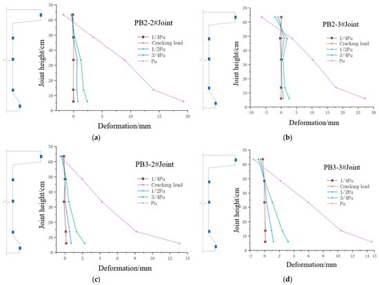 The distributed joint widths along the beam height: (a) PB2-2#Joint; (b) PB2-3#Joint; (c) PB3-2#Joint; (d) PB3-3#Joint.