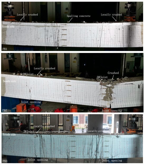 Before horizontal cracks emerged around the continuous rebars in beam PB3, crack development was not primarily concentrated at the joint position, unlike in the concrete keyed segmental beam (PB2). Similar to monolithic beams, vertical bending cracks fully developed across the pure bending section. After horizontal cracks appeared around the continuous rebars, local anchorage of these rebars failed, leading to gradual deterioration in joint bending stiffness. As such, the joint opened, the neutral axis shifted upwards, and the concrete at the top edge of the joint collapsed.
