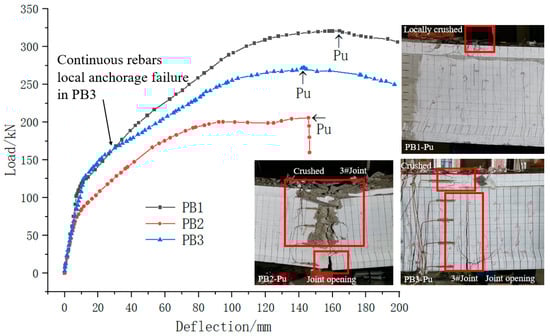 - After horizontal cracks appear near the continuous rebars, local anchorage failure of the continuous rebars occurs, leading to a significant decrease in structural stiffness and fluctuation in the load–displacement curve. Subsequently, the joints rapidly redistributed internal forces until the continuous rebars yielded and the concrete crushed along the top edge. During this stage, the flexural stiffness of the joints decreased, cracks concentrated at the joints, and the joints gradually opened. However, in comparison with beam PB2, the continuous rebars continued to effectively limit the widths of joint openings.