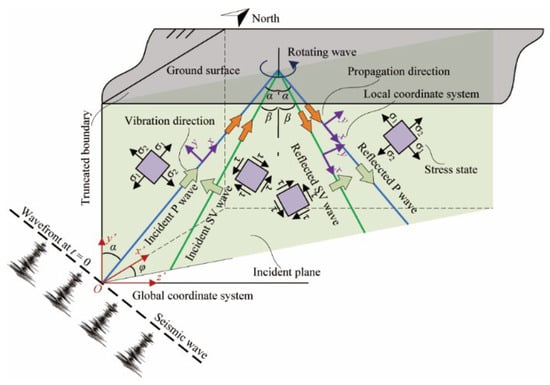 - The oblique incidence method effectively captures the traveling wave effect, whereas the attenuation and coherence effects are partially dependent on the random excitation method. In the analysis of P wave and SV wave incidence, the “rotation effect” due to oblique incidence must be accounted for, as it significantly influences the stress and deformation of the tunnel structure, exhibiting distinct rotational characteristics for different wave types.