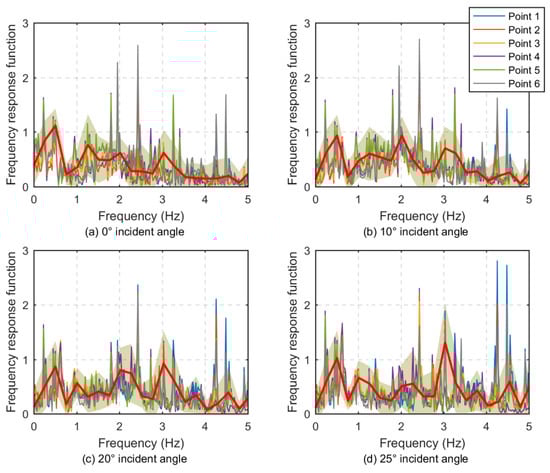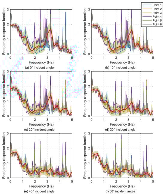 - Compared to tunnels with a circular cross-section, the low-frequency amplification of seismic waves in the surrounding rock and the variability of the frequency response function across different lining sections are more pronounced. Notably, the dominant frequency characteristics are very significant during P wave incidence; with the increase in the incidence angle, the attenuation of the seismic wave signal becomes more apparent. In contrast, the SV wave exhibits a more uniform behavior. These insights are of paramount importance for enhancing the understanding and refinement of the seismic design of tunnels and underground structures.