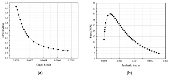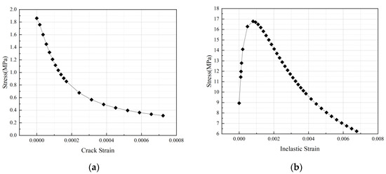 Damage evolution relationship of C30 concrete. (a) Tensile stress constitutive relationship; (b) compressive stress constitutive relationship.