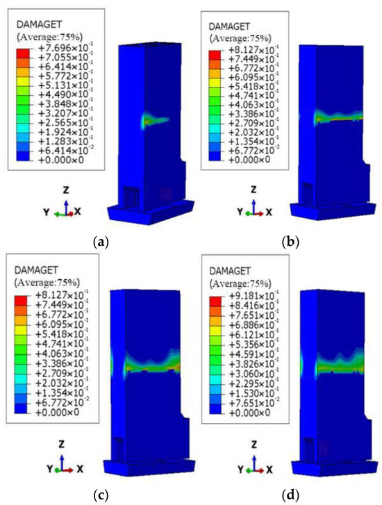Tensile damage evolution process of the intake tower. (a) t = 2.4 s, (b) t = 2.8, (c) t = 7.8 s, (d) t = 10.0 s.