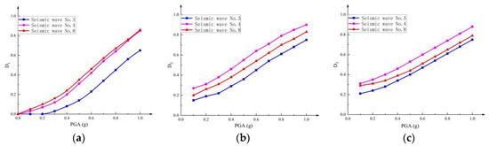 The IDA curve of the damage index of the front of the intake tower structure is shown in Figure 9a, which was analyzed. In this study, LSD11 = 0.05, LSD12 = 0.16, LSD13 = 0.35, and LSD14 = 0.85 are defined as the performance level values of the intake tower structure based on its pre-damage indices.