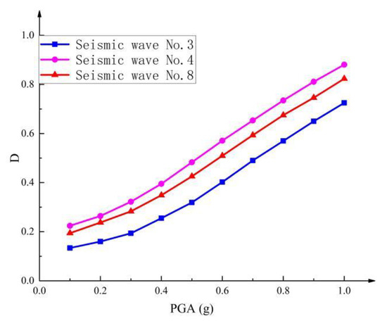 It can be seen in Figure 15 that, under the designed basic seismic acceleration, the intake tower structure changed from basically intact to completely damaged. Additionally, the failure probability considering only displacement was the largest, followed by the failure probability considering the post-damage index of the tower, and the failure probability considering the above two indices was the smallest. When the structure was in a slightly damaged state, and when the ground-shaking intensity was greater than the designed basic seismic acceleration, the failure probability of the back of the tower, considering the damage index, increased rapidly and exceeded the failure probability considering the displacement. When the damage state of the structure entered into the moderate damage level, the failure probability of the back of the tower only exceeded the failure probability considering displacement when the ground-shaking intensity was greater than three times the designed basic seismic acceleration.