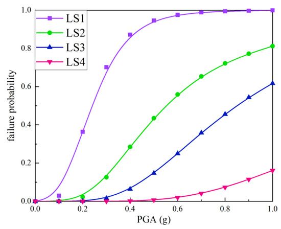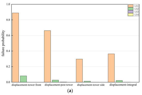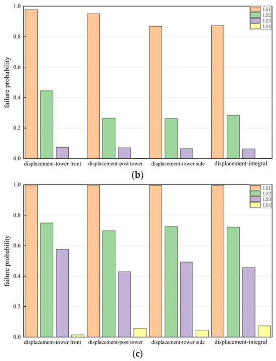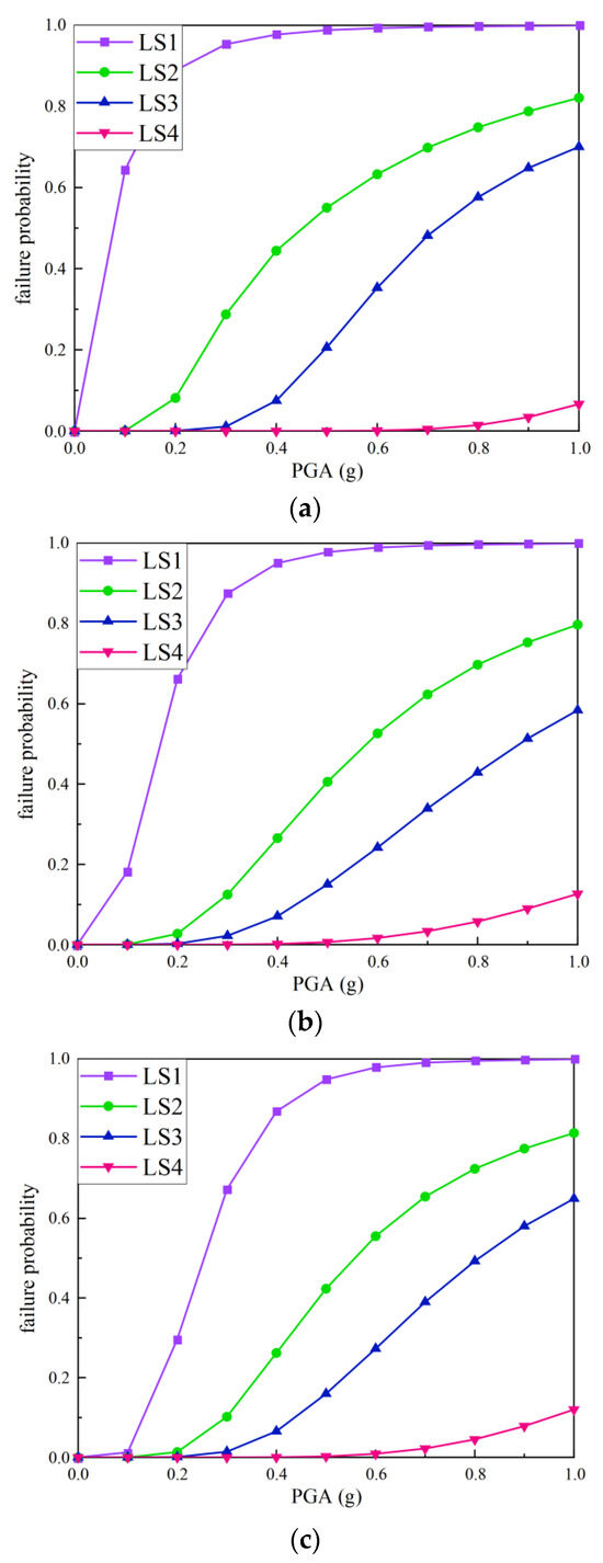 In Figure 11a, it can be seen that the probabilities of the structure reaching LS1 and LS2 under the designed seismic acceleration are 88.87% and 8.13%, respectively, and the probabilities of reaching the LS3 and LS4 performance states are small and negligible. As shown in Figure 11b, the probabilities of the intake tower structure reaching the first three limit states under the designed seismic acceleration are 66.25%, 2.71%, and 0.23%, respectively. As shown in Figure 11c, the probabilities of the intake tower structure failing to reach LS1 and LS2 under the designed seismic acceleration are 29.65% and 1.33%, respectively. As shown in Figure 12, the probabilities of the intake tower structure reaching LS1, LS2, and LS3 are 36.35%, 2.27%, and 0.11%, respectively.
