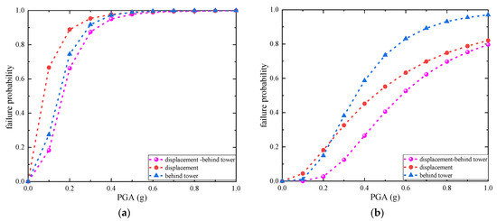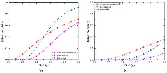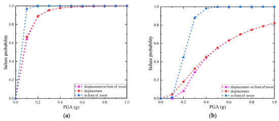 It can be seen from Figure 16 that the displacement fragility curve of the intake tower structure was higher than the other two curves for the whole damage process under the designed basic seismic acceleration. When the structure entered into the slightly damaged level, with an increase in ground-shaking intensity, it appears that the failure probability considering the damage index of the tower side inversely exceeded the failure probability considering the displacement.