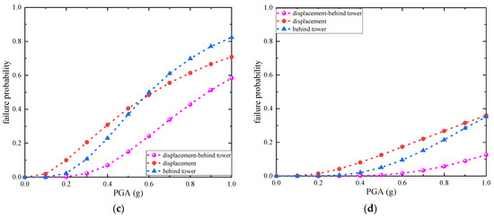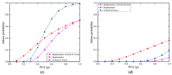 As can be seen in Figure 14, under the designed basic seismic acceleration, when the intake tower structure was in the basic intact and slightly damaged state, considering the damage index, the failure probability of the front of the tower was larger than the other two indices. The difference between the failure probability considering the displacement and the damage index of the tower front and the failure probability considering the displacement is very small. When the damage state of the structure entered into the medium level, considering the displacement, the failure probability was larger than the other two indices. However, when the local vibration intensity was greater than two times the designed basic seismic acceleration, and when the intake tower structure had sustained medium-level damage, the failure probability of the tower front was the largest, considering the damage index, and the probability of the other two indices were correlated with the increase in the local vibration intensity.