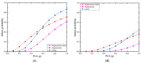 Failure probability of intake tower structures under three peak ground-shaking accelerations: (a) 0.2 g, (b) 0.4 g, (c) 0.8 g.